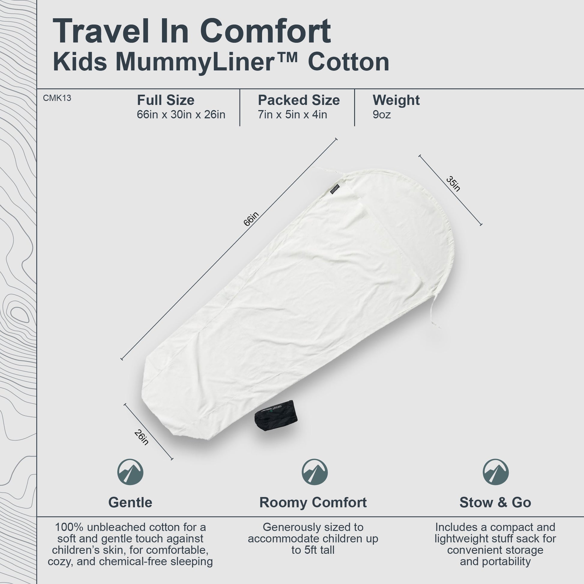 Crafted from high-quality cotton, the Kids MummyLiner™ is designed to be lightweight and breathable, ensuring your child stays cozy and comfortable all night long. This liner not only adds an extra layer of comfort but also helps extend the life of their sleeping bag. Plus, it's machine washable, making it easy to keep clean and fresh for every new adventure.