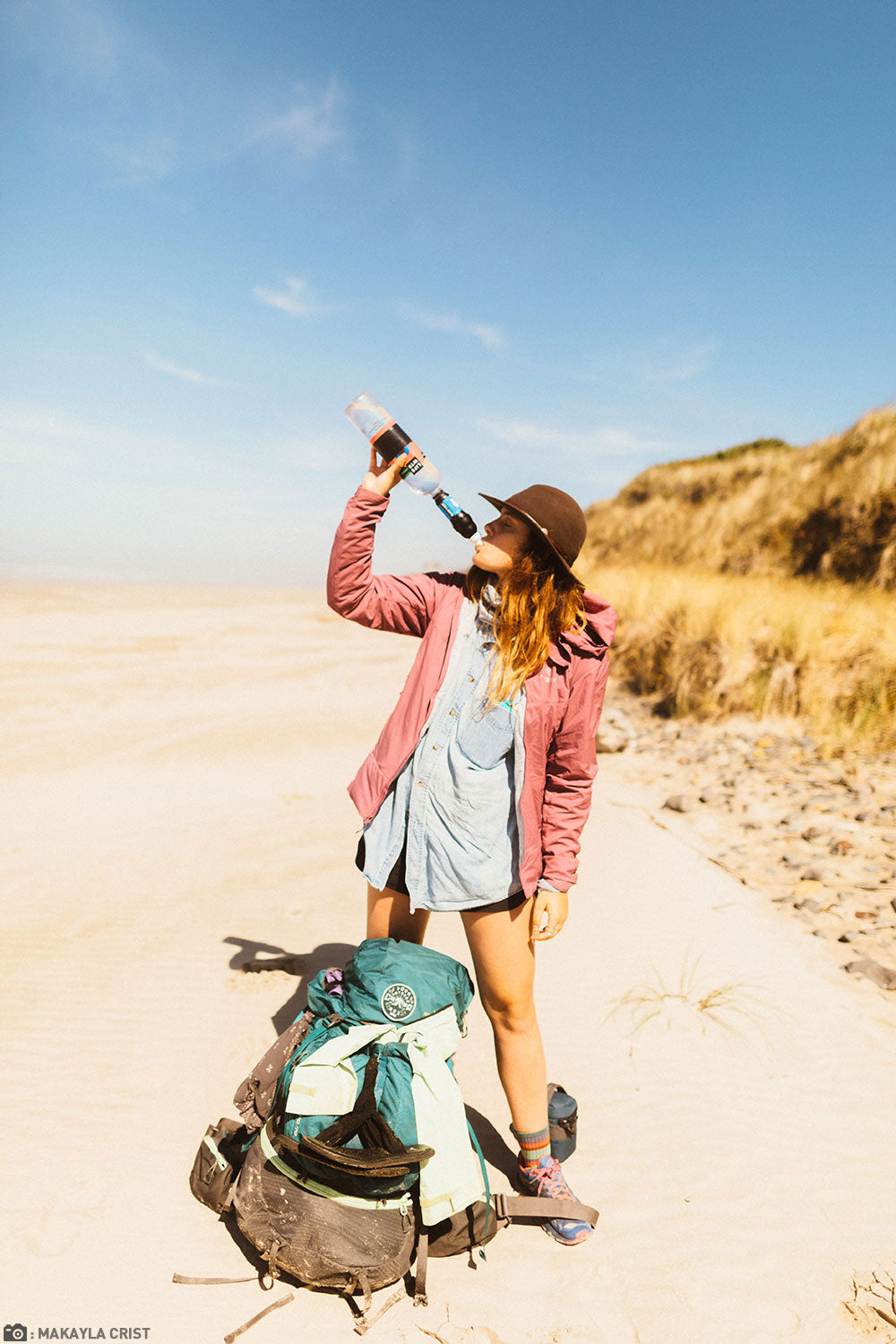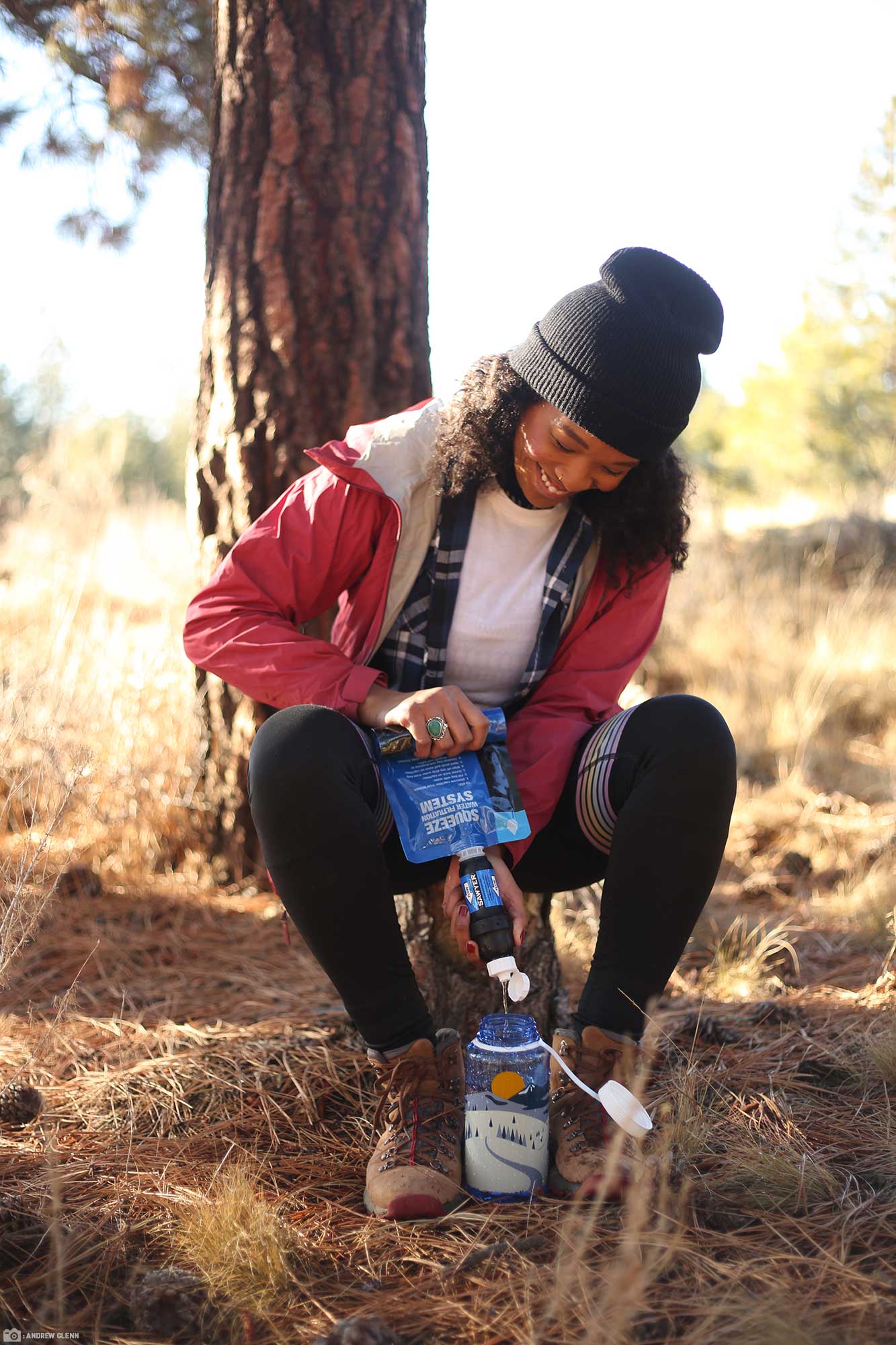 1) Squeeze the bag and filter water into your water bottle or container of choice.